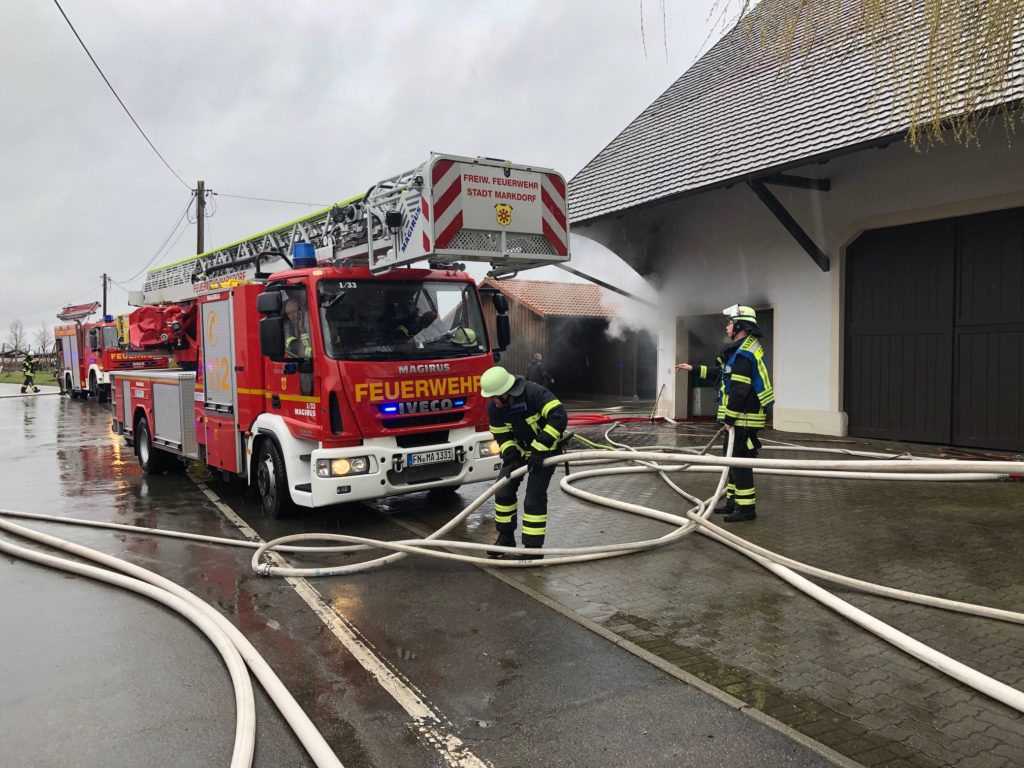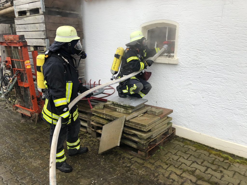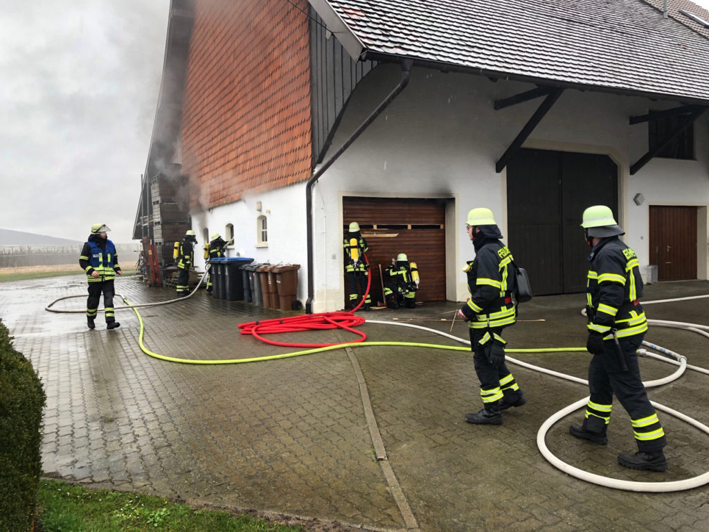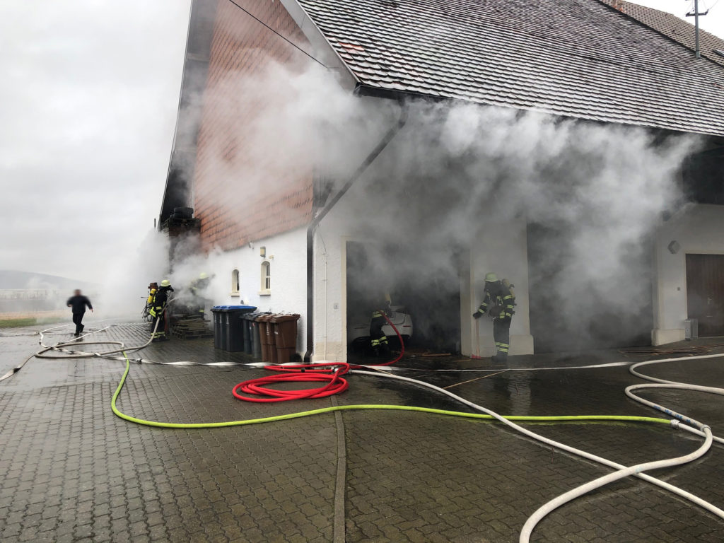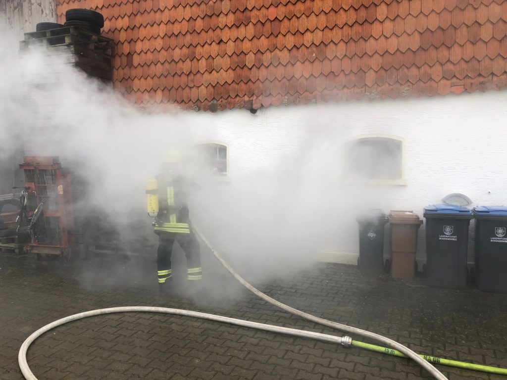 Bei Eintreffen der ersten Kräfte der Feuerwehr zeigte sich eine Rauchentwicklung aus einer auch als Werkstatt genutzten Garage im ehemaligen Wirtschaftsteil eines Hofes.