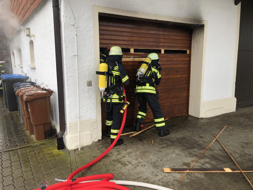Wir begannen sofort mit Trupps unter schwerem Atemschutz den Angriff auf den Brand durch ein kleines Seitenfenster, sowie durch das Garagentor, das zuerst aufgebrochen werden musste.