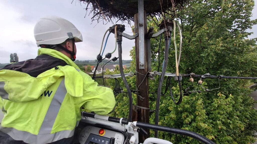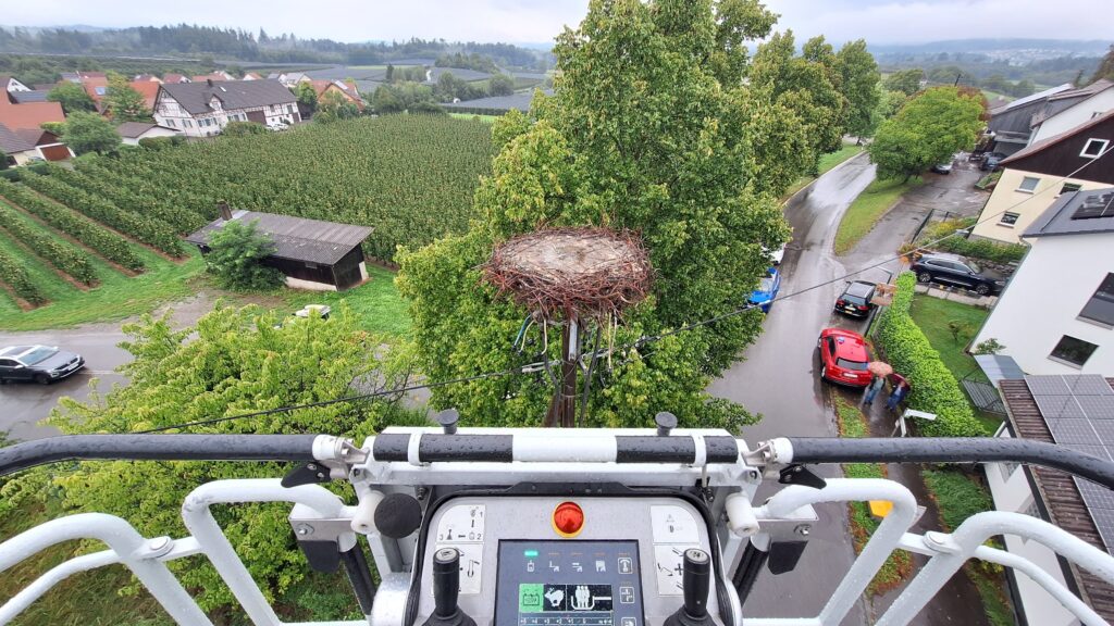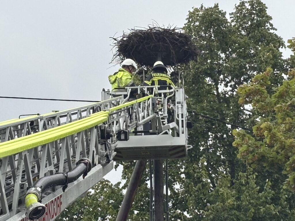 Bei Eintreffen des Notdienstes des Stomversorgers wurde die Installation oben am Mast mit Hilfe der Drehleiter inspiziert. Tiere befanden sich keine in dem Nest.