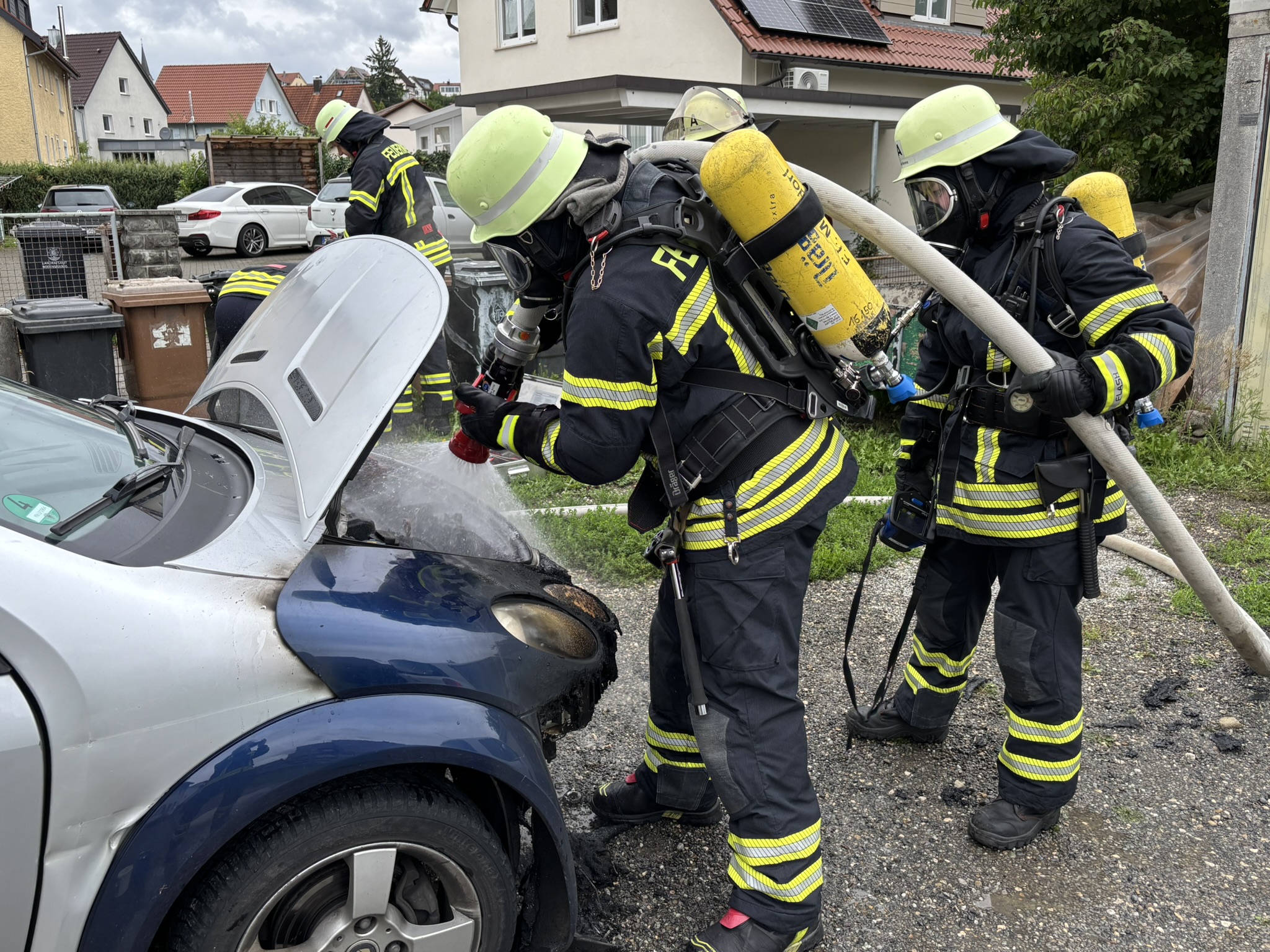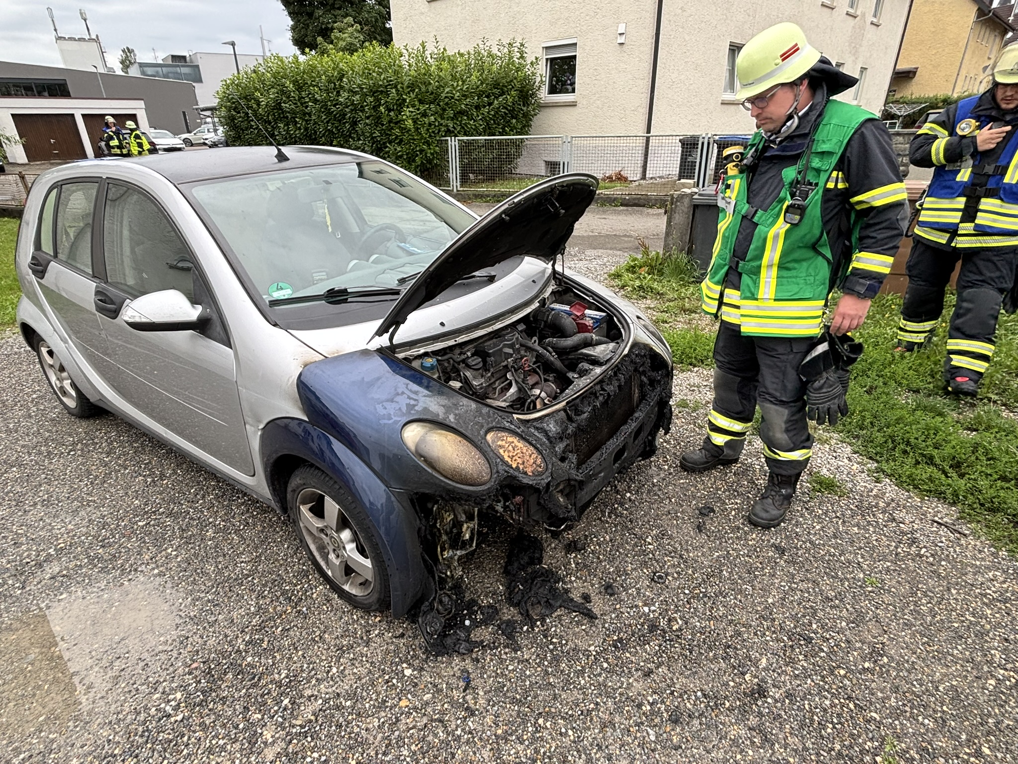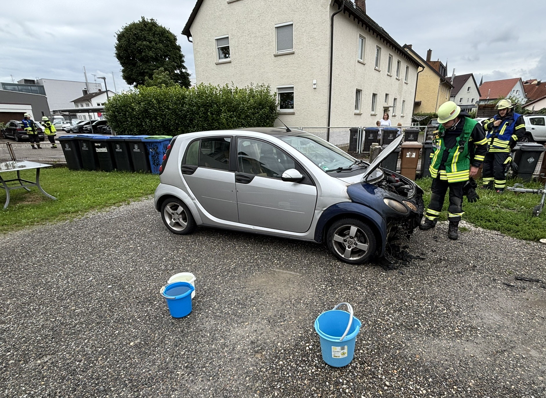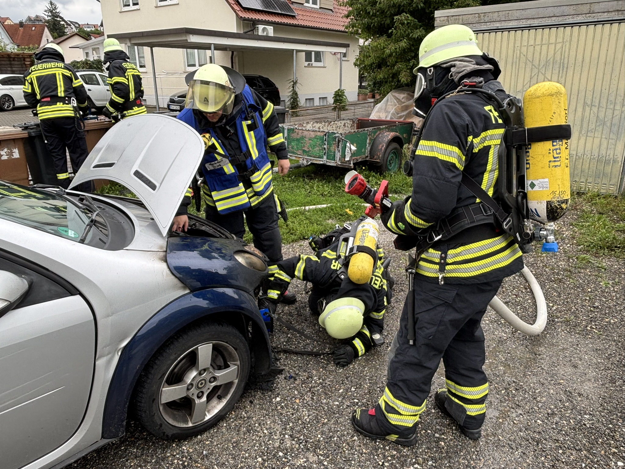 Vor Ort zeigte sich, dass sich der betreffende PKW in einem Hof in der Gartenstraße befand und das Feuer bereits gelöscht war. Anwohner hatten mit Wassereimern den Brand soweit gelöscht, dass auch keine weitere Gefährdung mehr für die Umgebung bestand.