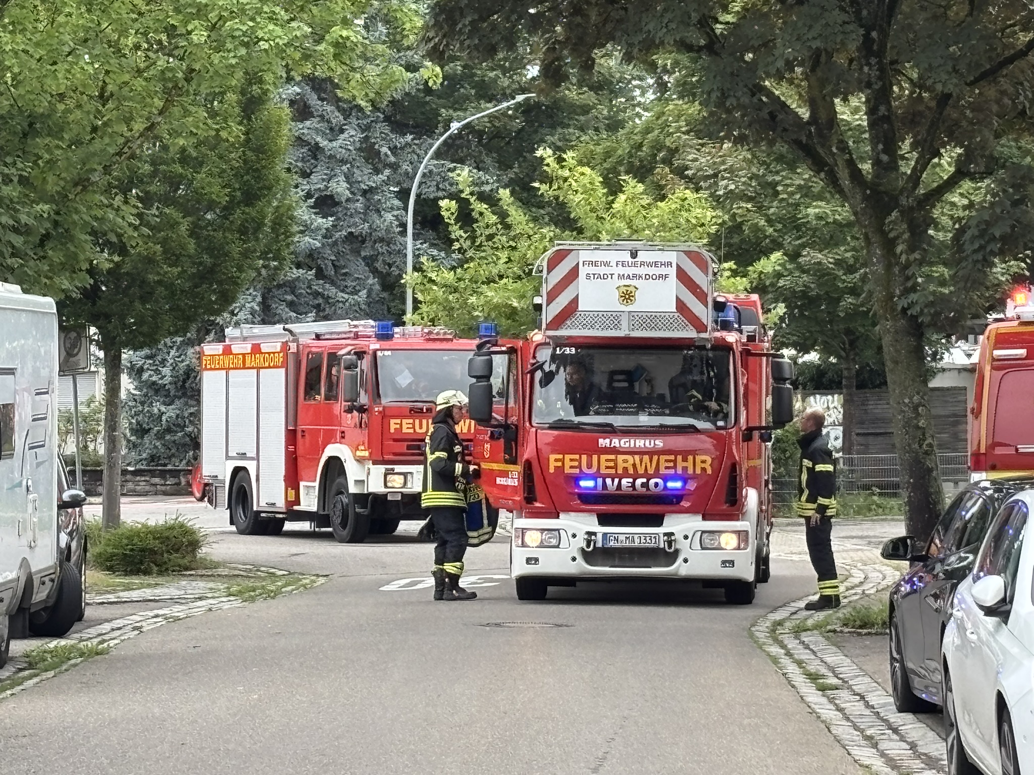 Am Montagnachmittag wurde die Abteilung Markdorf-Stadt wegen eines Fahrzeugbrandes in der Riedstraße alarmiert. Aufgrund der Bebauung dort und da sich ein weiteres Fahrzeug direkt daneben befand, hatte die Leitstelle mit dem Alarmstichwort “Brand Gross-Kfz” alarmiert.