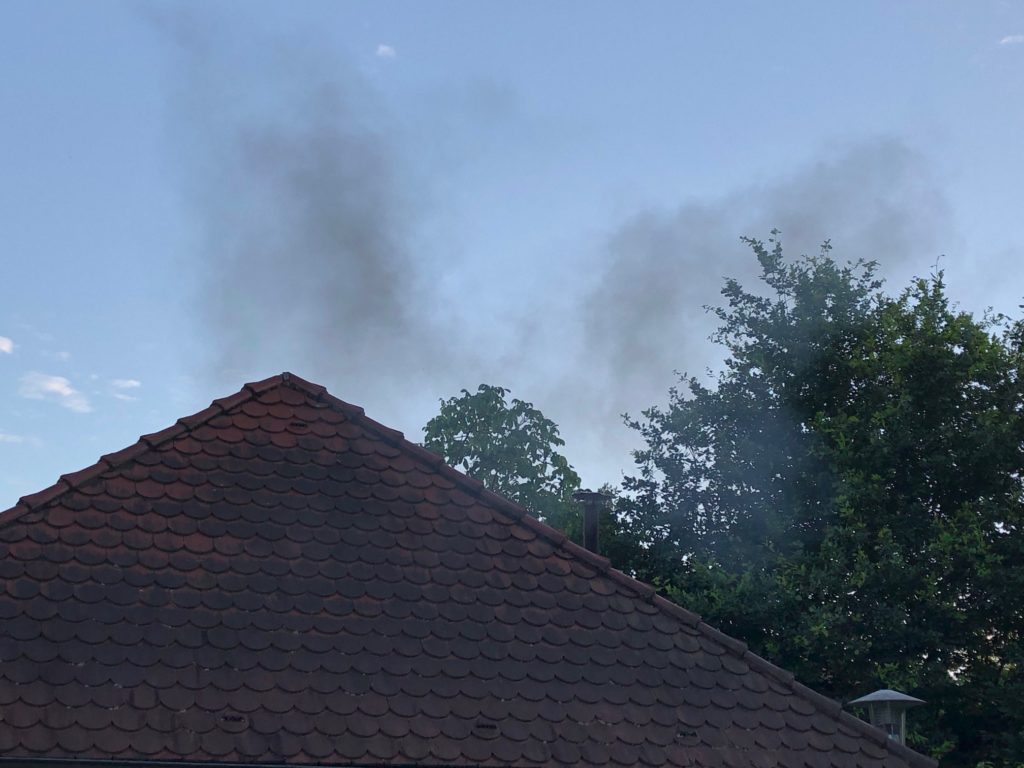 In Rücksprache mit dem Energieversorger und dem hinzugezogenen Hausmeister, bekamen wir die Kenntnis, dass aufgrund des momentanen Stromausfalls im Stadtviertel, das Notstromaggregat angesprungen war, und dabei eine schwarze Abgaswolke ausgestoßen hat. Mit einem erneuten Start des Dieselmotors , lies sich die Rauchwolke reproduzieren (Foto).