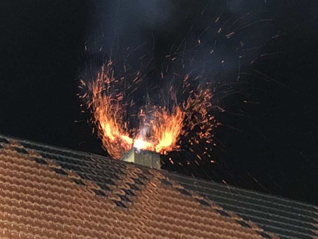 Der Schornsteinfeger räumte den Ofen aus und kehrte den Kamin, um die brennenden Ablagerungen zu entfernen, was man am wieder verstärkten Funkenflug aus dem Kamin erkennen konnte. So wurde dann eine Verringerung der Hitzebelastung des Kamins erreicht. .