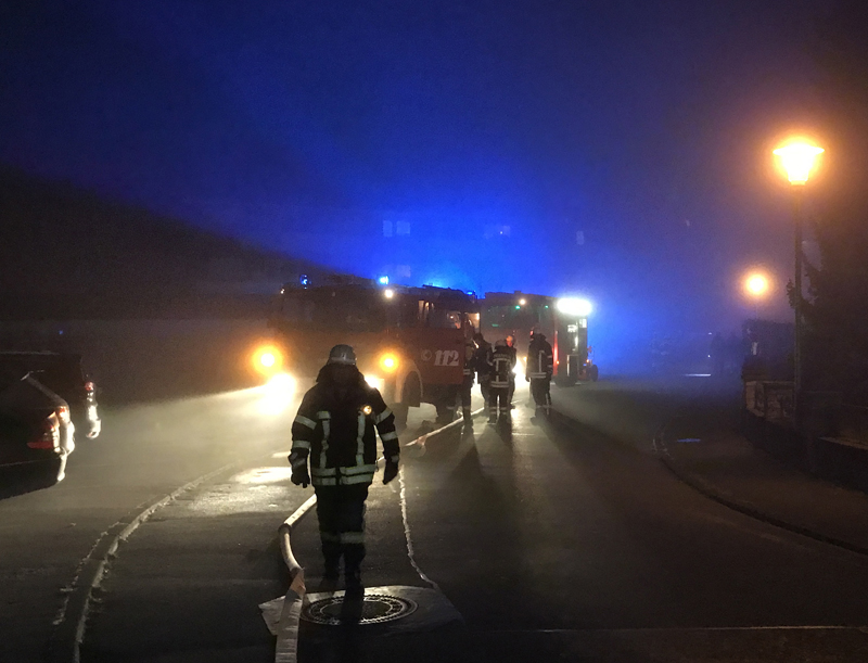 Die ersteintreffenden Kräfte mit dem ELW und Kommandant Daniel Kneule stellten bei der Erkundung im Treppenhaus fest, dass es im ersten Obergeschoss des Gebäudes brennt und wegen starker Rauchentwicklung eine weitergehende Erkundung innen unmöglich ist.