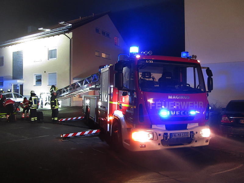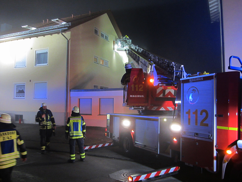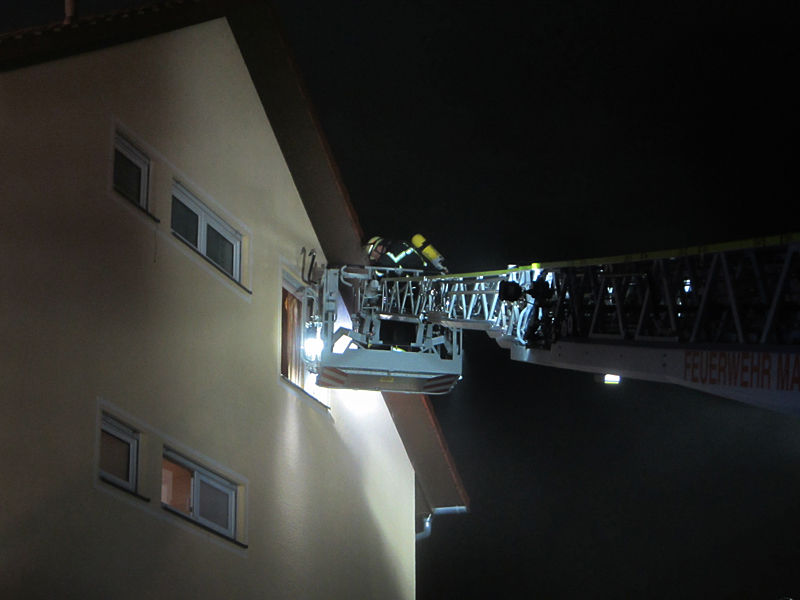 Da das Feuer schnell gelöscht war, musste die Person im Dachgeschoß nicht mehr mit der Drehleiter gerettet werden, sondern konnte, vom Notarzt betreut, über das jetzt sichere Treppenhaus das Gebäude verlassen.