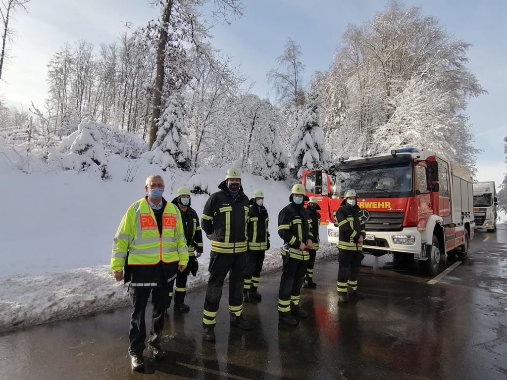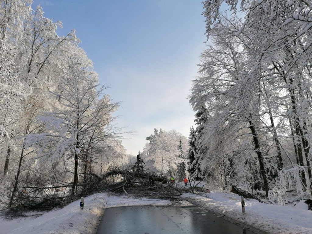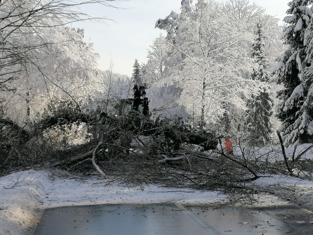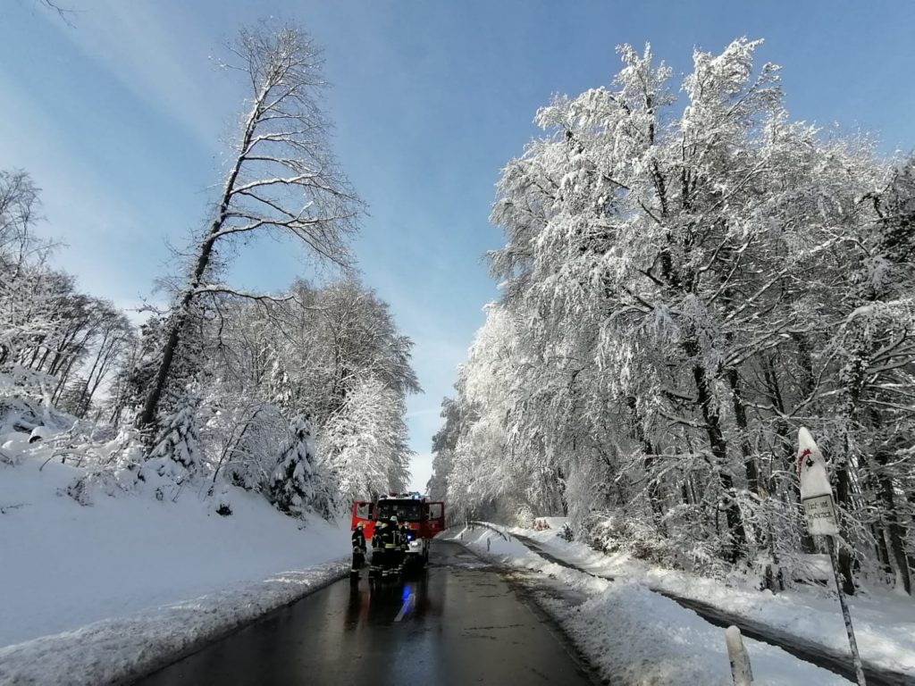 Nach den starken Schneefällen der letzten Nacht, die verbreitet im Landkreis für Verkehrschaos und Schneebruch gesorgt hatten, wurden auch wir am Freitagmorgen wegen eines umgestürzten Baums alarmiert, der die Kreisstraße K7724 Richtung Raderach blockierte.
