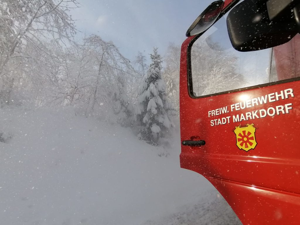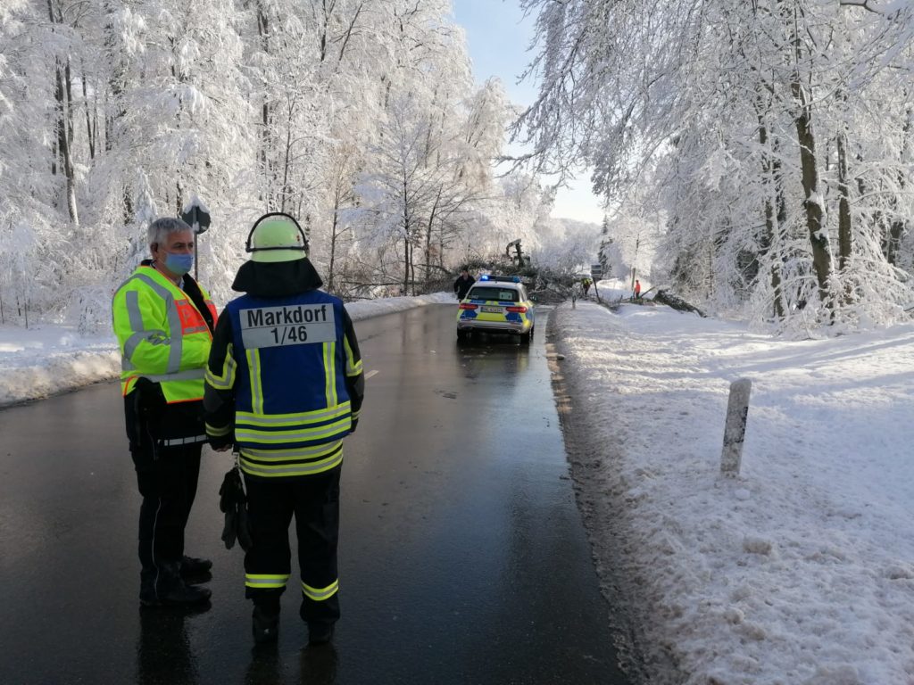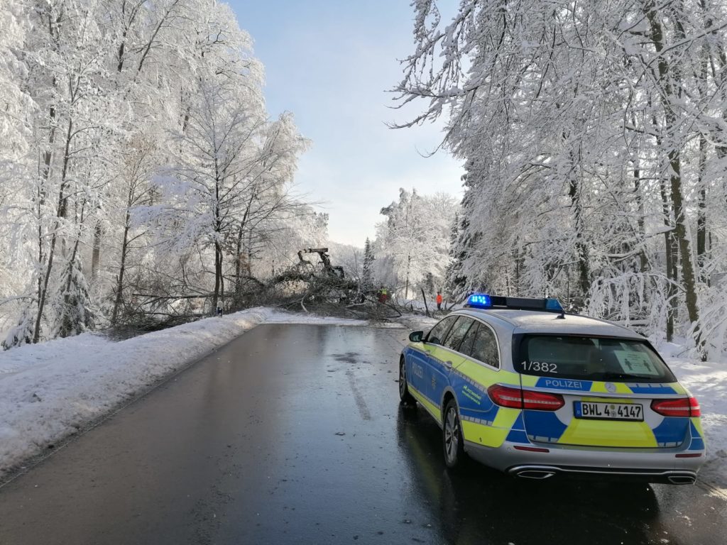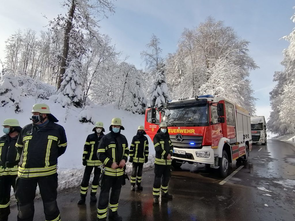 Nach den starken Schneefällen der letzten Nacht, die verbreitet im Landkreis für Verkehrschaos und Schneebruch gesorgt hatten, wurden auch wir am Freitagmorgen wegen eines umgestürzten Baums alarmiert, der die Kreisstraße K7724 Richtung Raderach blockierte.