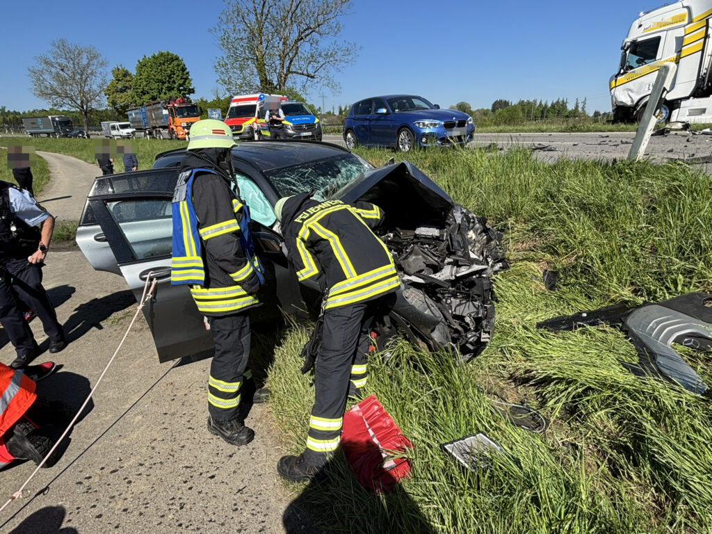 Bei Eintreffen der Feuerwehr waren die beiden Insassen des PKW, sowie der LKW-Fahrer bereits von Ersthelfern und Rettungsdienstkräften betreut. Ein sich ebenfalls im PKW befindlicher Hund war augenscheinlich unverletzt geblieben.