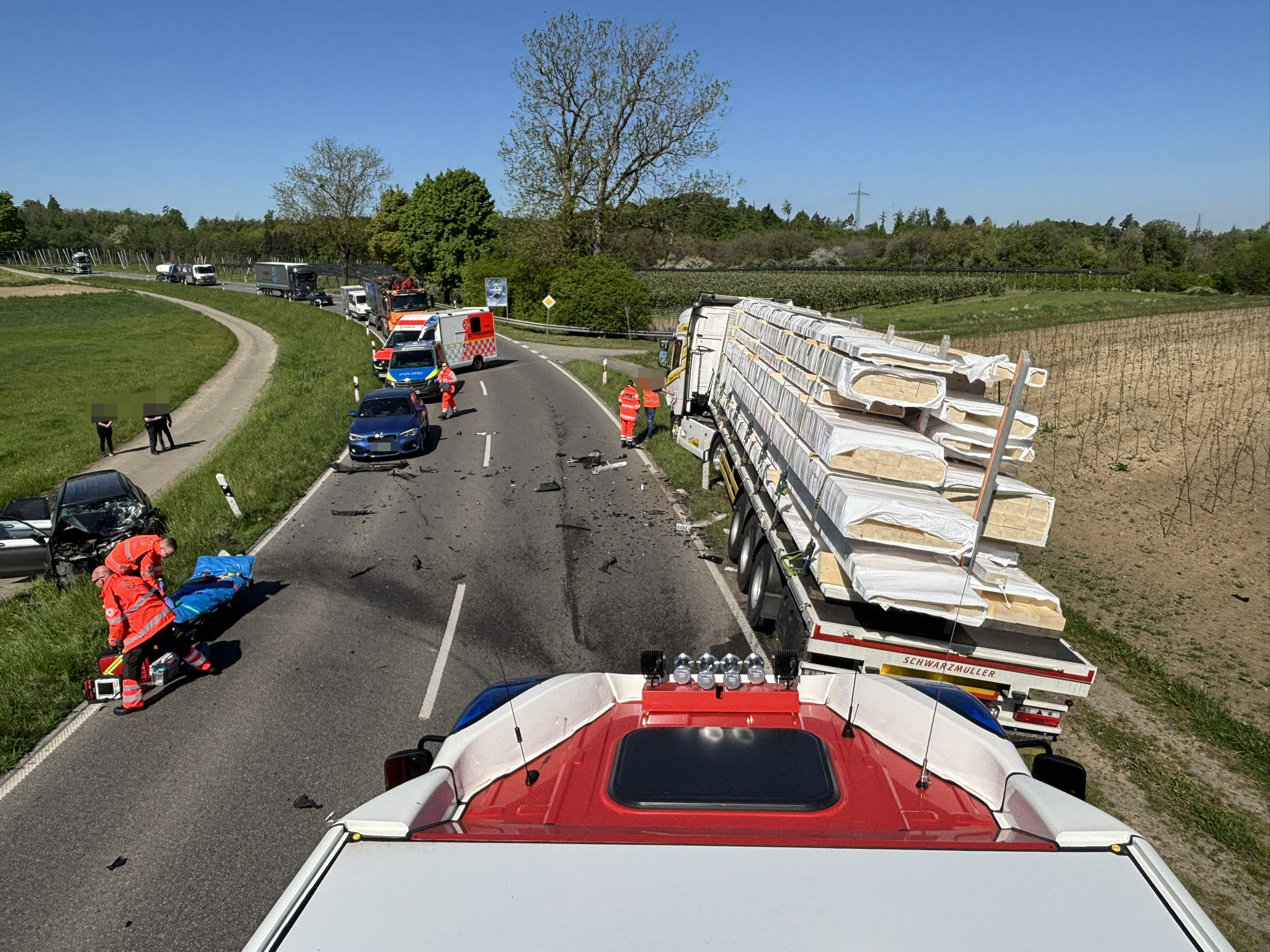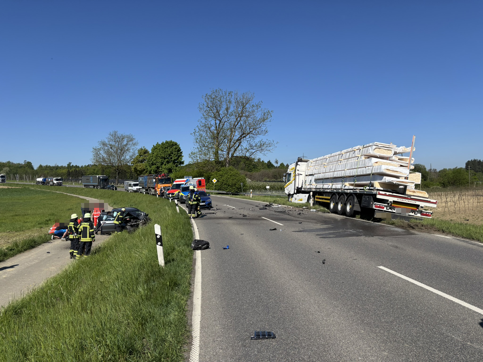 Bei Eintreffen der Feuerwehr waren die beiden Insassen des PKW, sowie der LKW-Fahrer bereits von Ersthelfern und Rettungsdienstkräften betreut. Ein sich ebenfalls im PKW befindlicher Hund war augenscheinlich unverletzt geblieben.