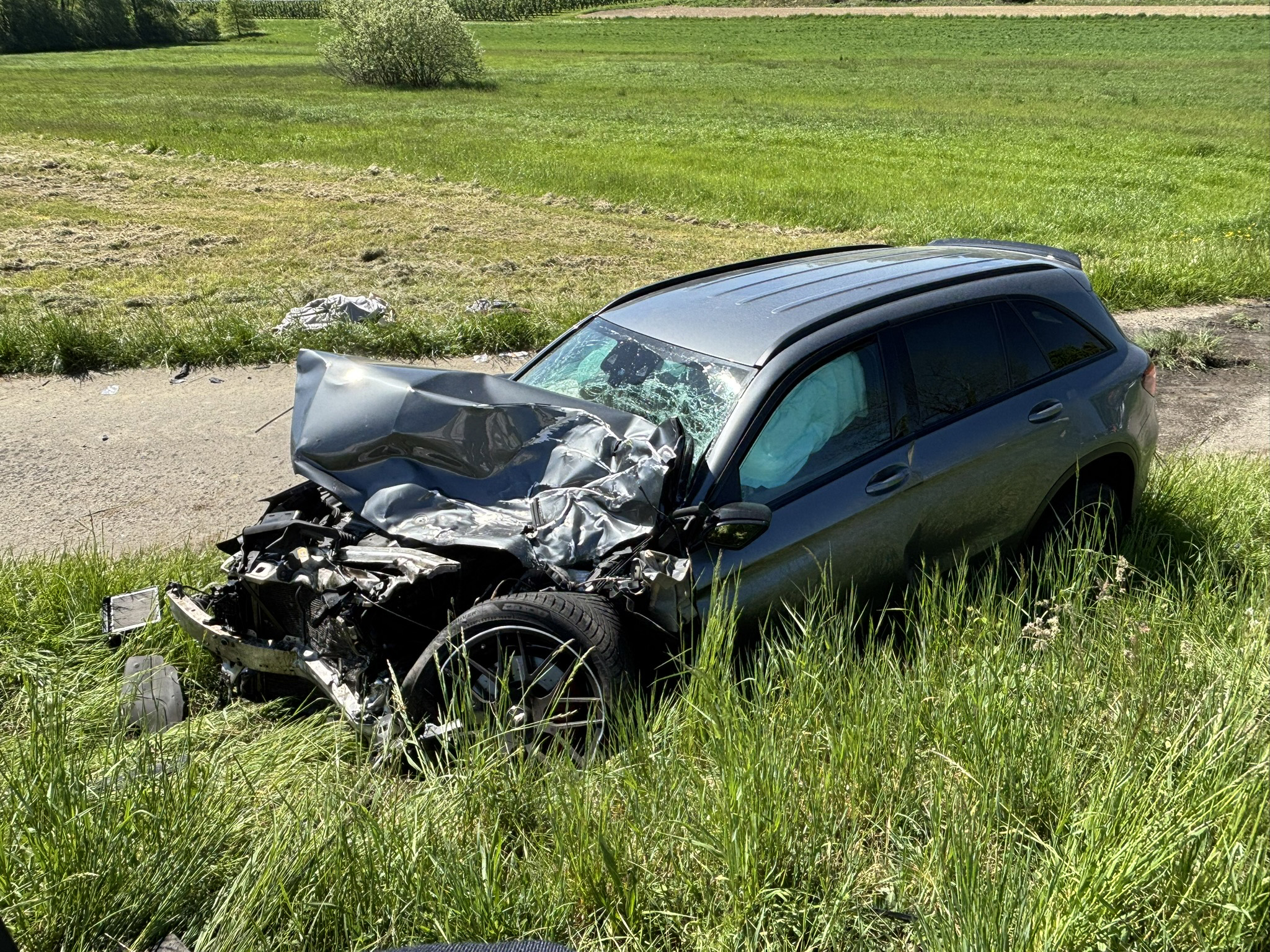 Im Begegnungsverkehr waren der PKW versetzt frontal mit dem LKW kollidiert. Der PKW wurde von der Straße auf die unten liegende Böschung geschleudert, der LKW stand in leichter Schräglage auf dem gegenüberliegenden Bankett.