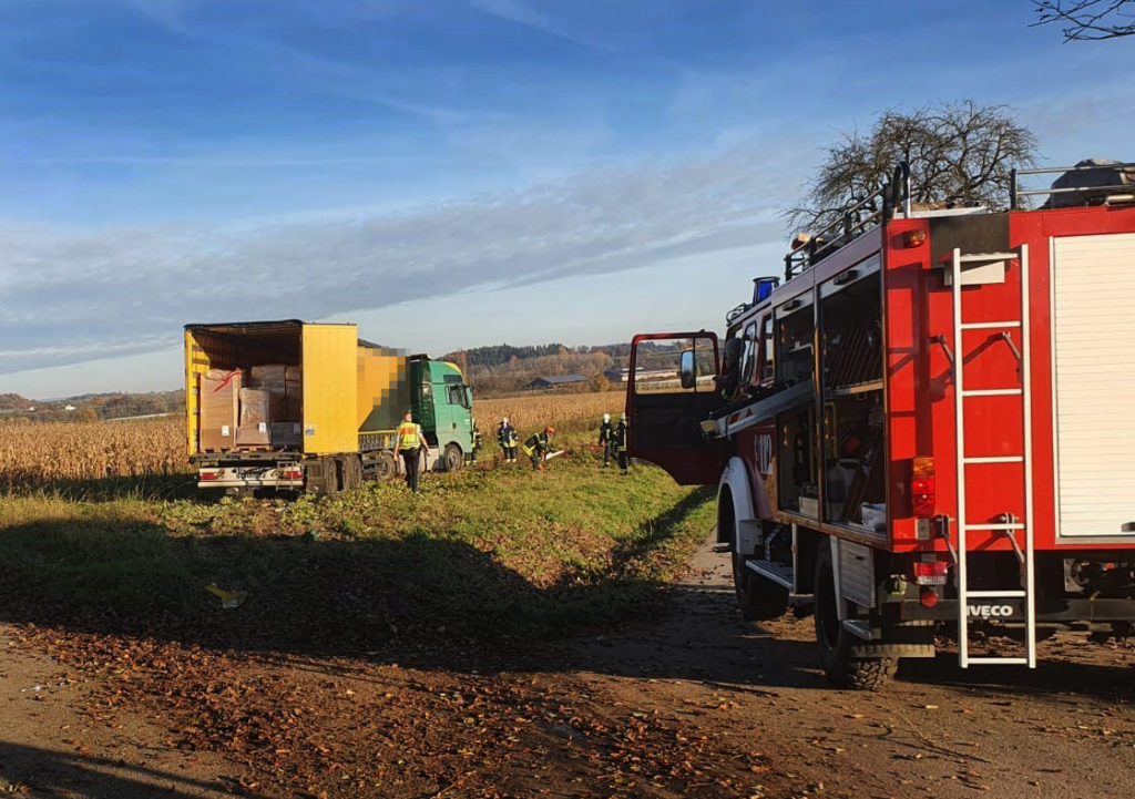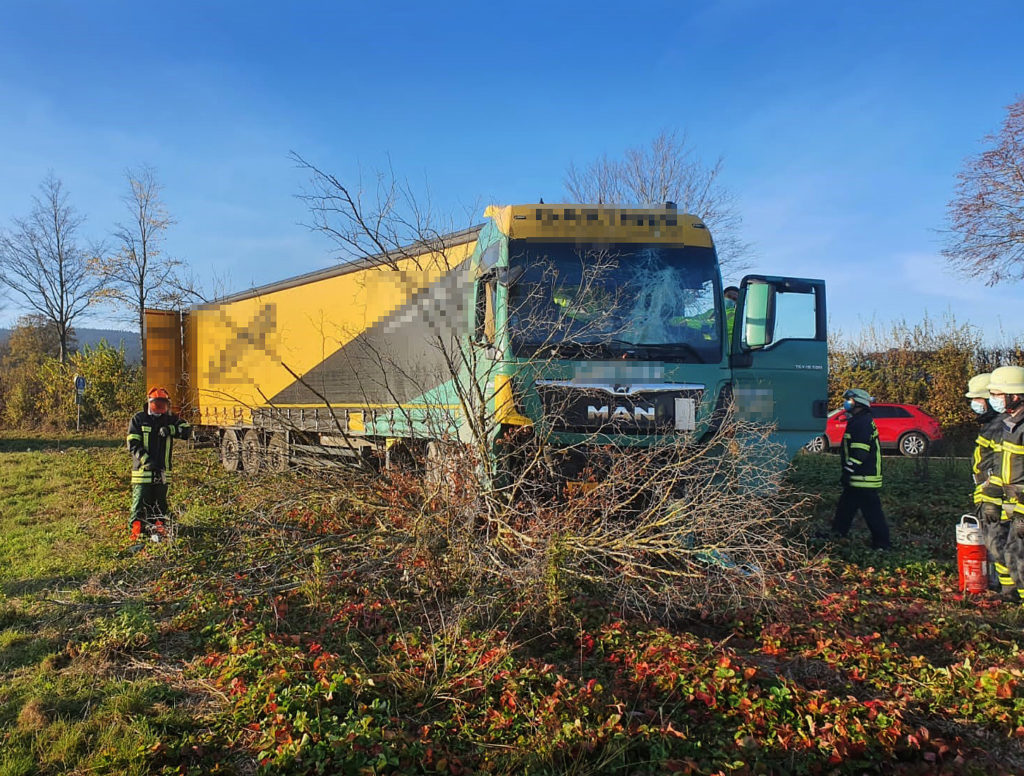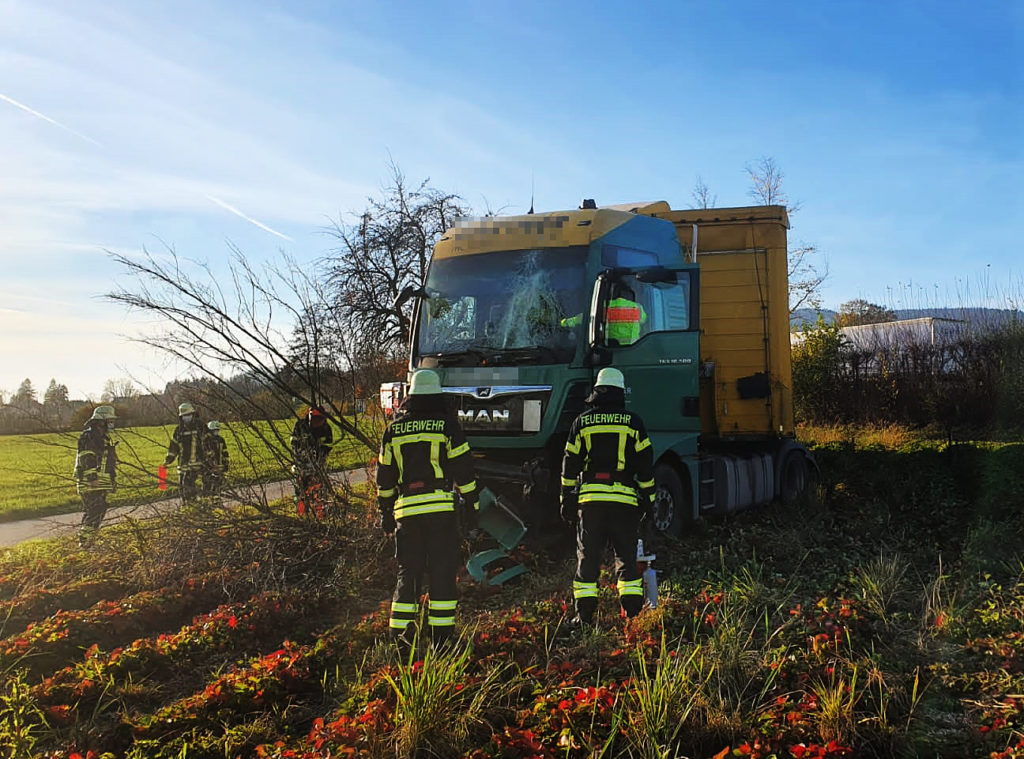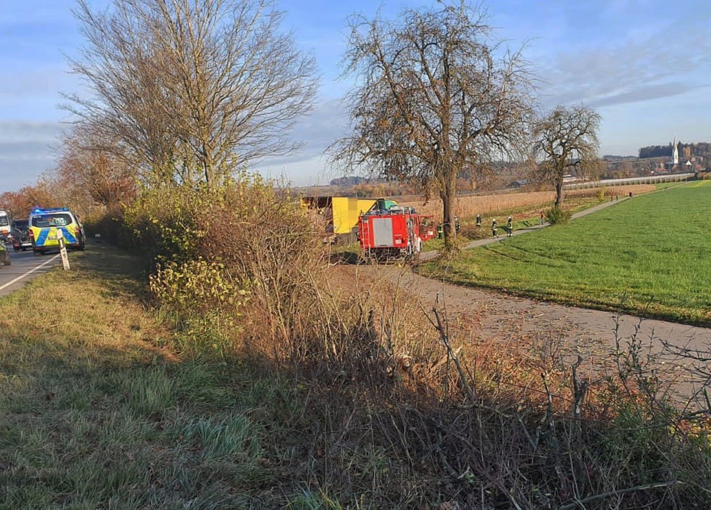 Bei Eintreffen der Feuerwehr zeigte sich, dass ein voll beladener Sattelschlepper in Fahrtrichtung Ravensburg alleinbeteiligt nach rechts von der Straße abgekommen, ein Gebüsch durchbrochen und in einem Ackerstück beschädigt zum stehen gekommen war.