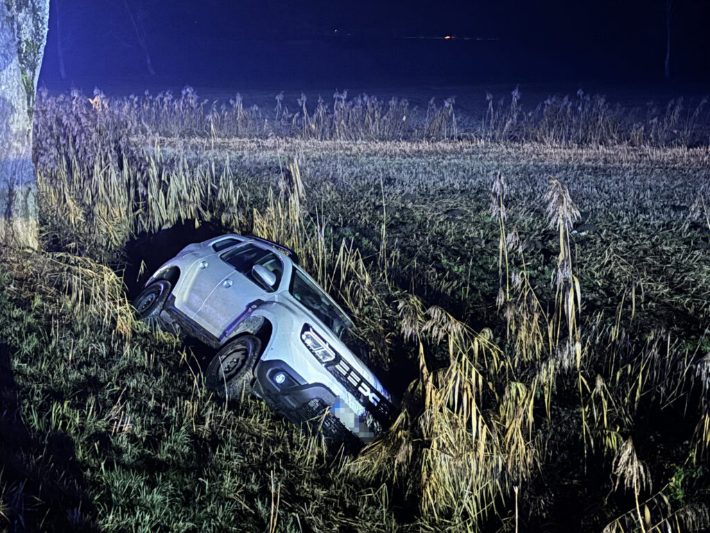In der Senke war ein PKW in Fahrtrichtung Markdorf nach links von der Fahrbahn abgekommen, hatte knapp einen Baum verfehlt und war in Schräglage tief hinter der Leitplanke in einem Graben zum liegen gekommen.