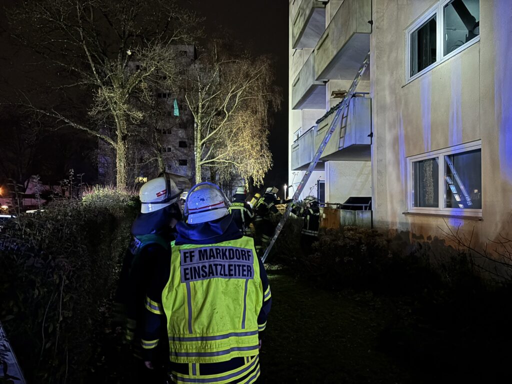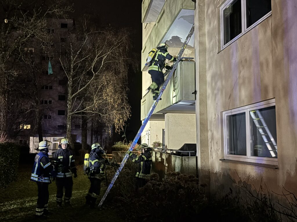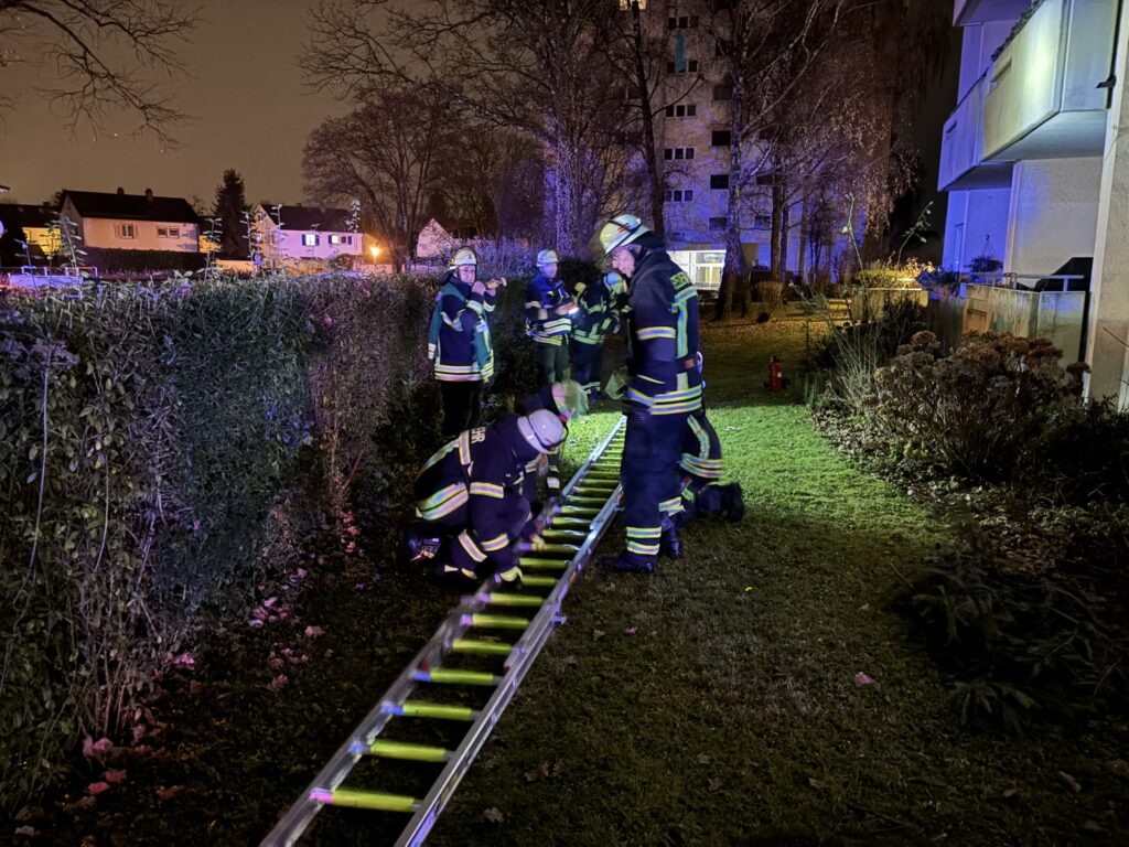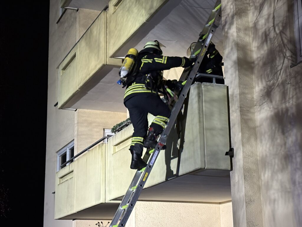 Ein Trupp unter Atemschutz stieg über die Steckleiter zu dem Balkon im ersten Obergeschoß des Mehrfamilienhauses auf und fand hier zwei medizinische Gasflaschen eines Beatmungsgeräts vor, wovon eine nicht komplett zugedreht war. An dieser trat dann Sauerstoff unter Zischen aus.