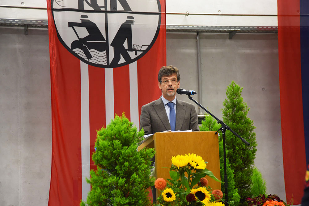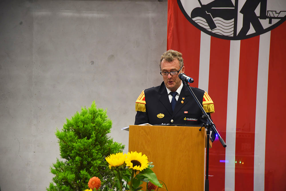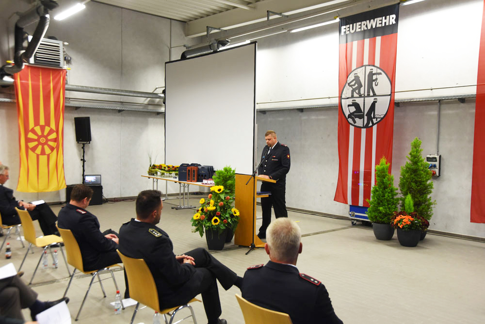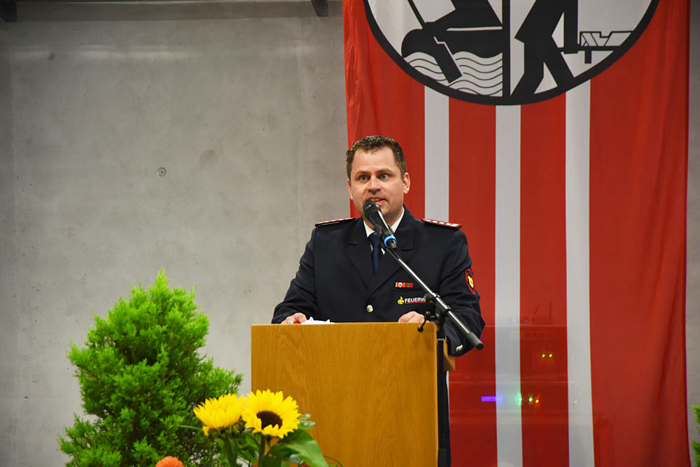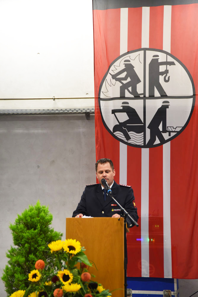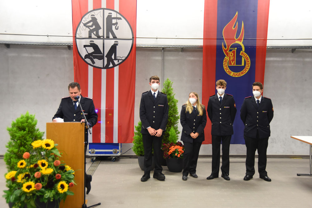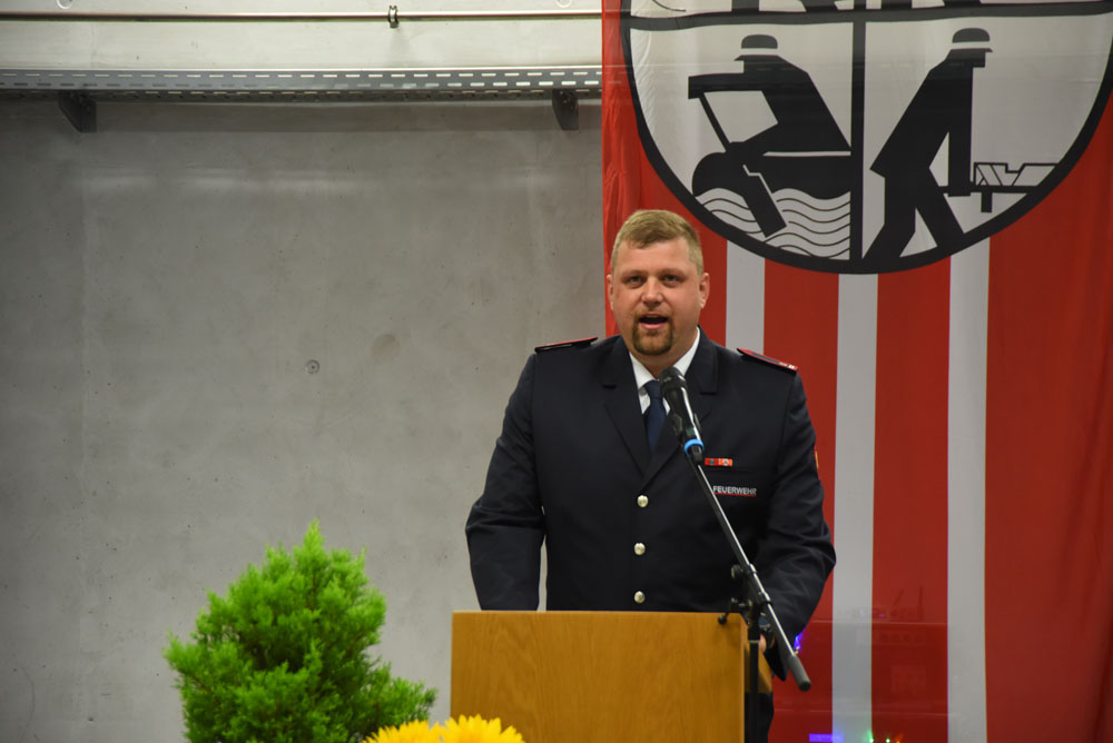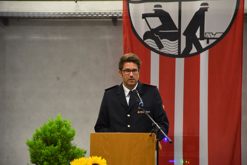 Kommandant Daniel Kneule begrüßte die Kameradinnen und Kameraden, die in die Feuerwehr Markdorf aufgenommen wurden, bzw aus der Jugendfeuerwehr in die aktive Wehr übergetreten sind.
