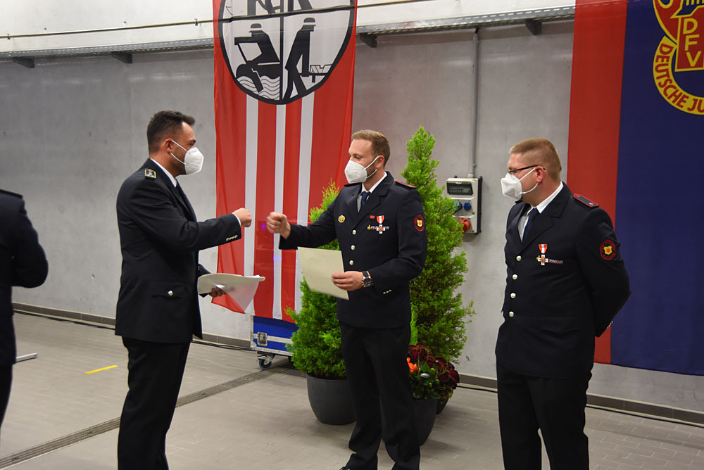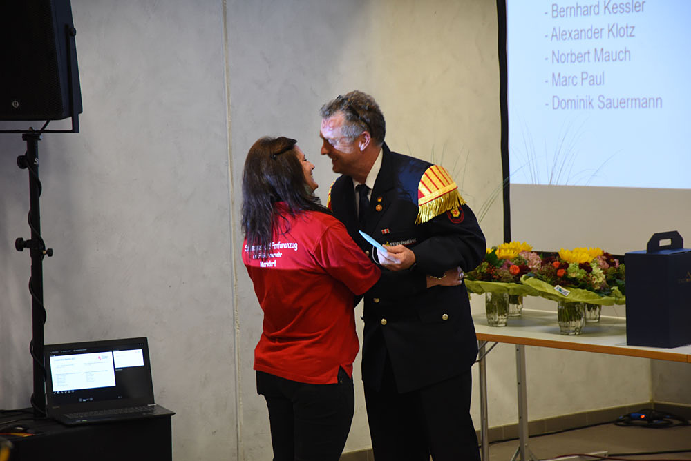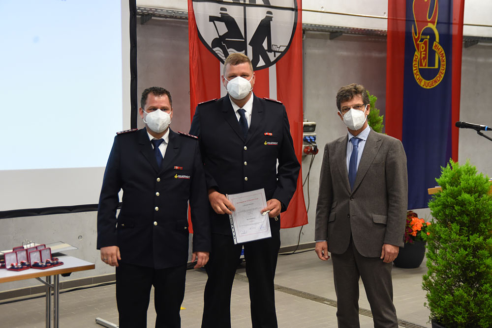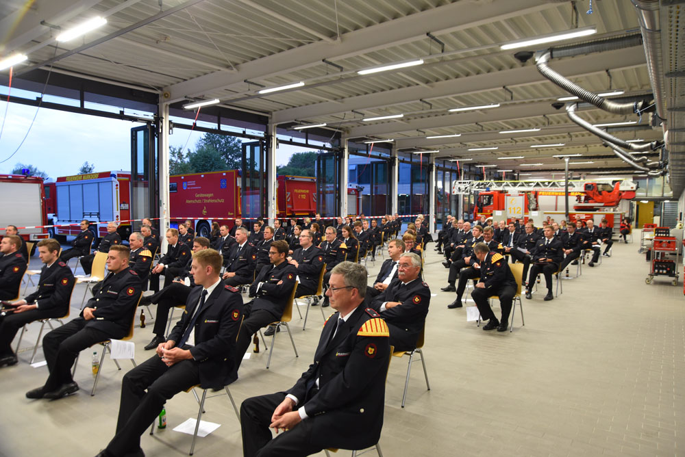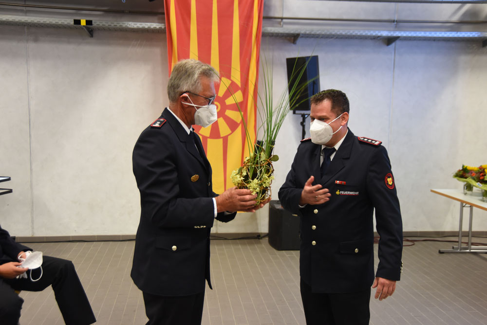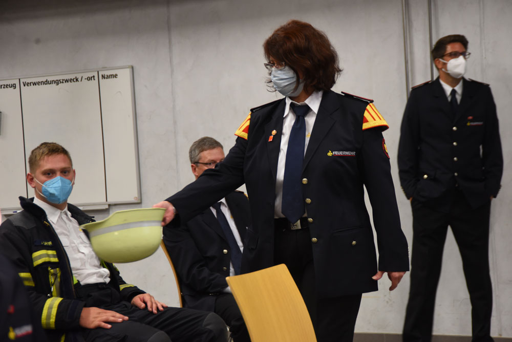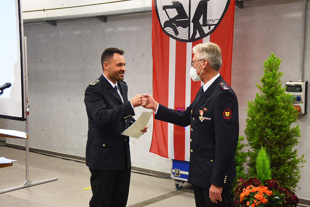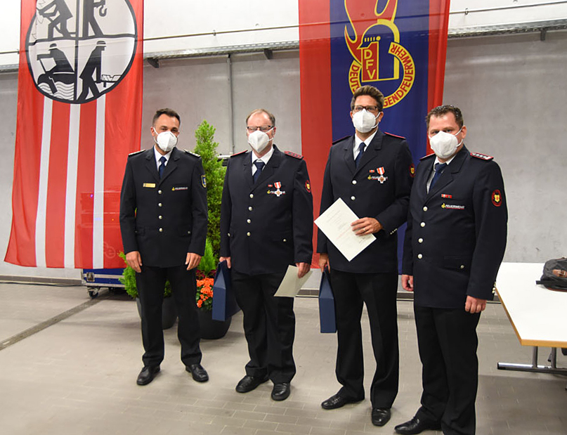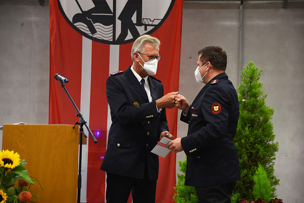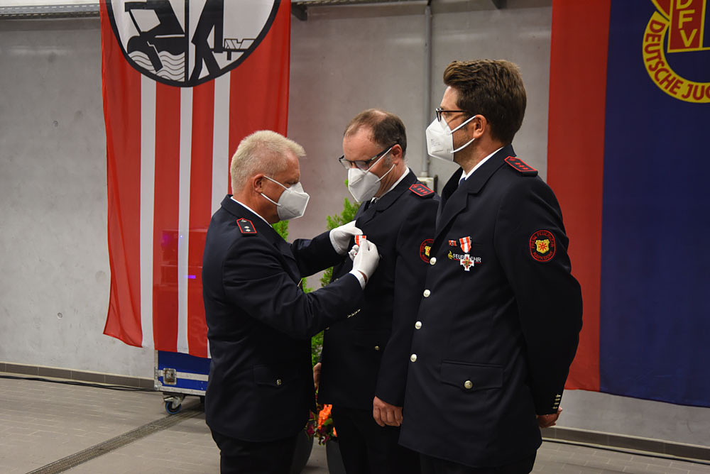 Nachdem die Versammlung wieder vollzählig im Feuerwehrhaus war, wurden die Beförderungen ausgesprochen. Nach den Ansprachen des Bürgermeisters und des stellvertretenden Kreisbrandmeisters wurden die Ehrungen des Landes Baden-Württemberg für langjährigen Feuerwehrdienst verliehen.