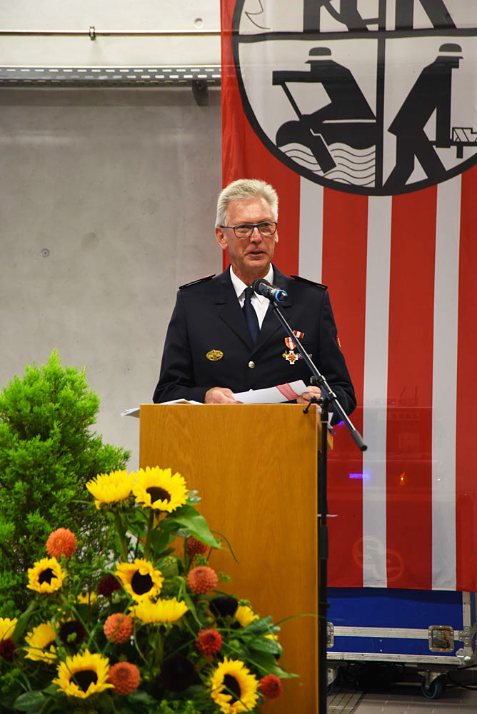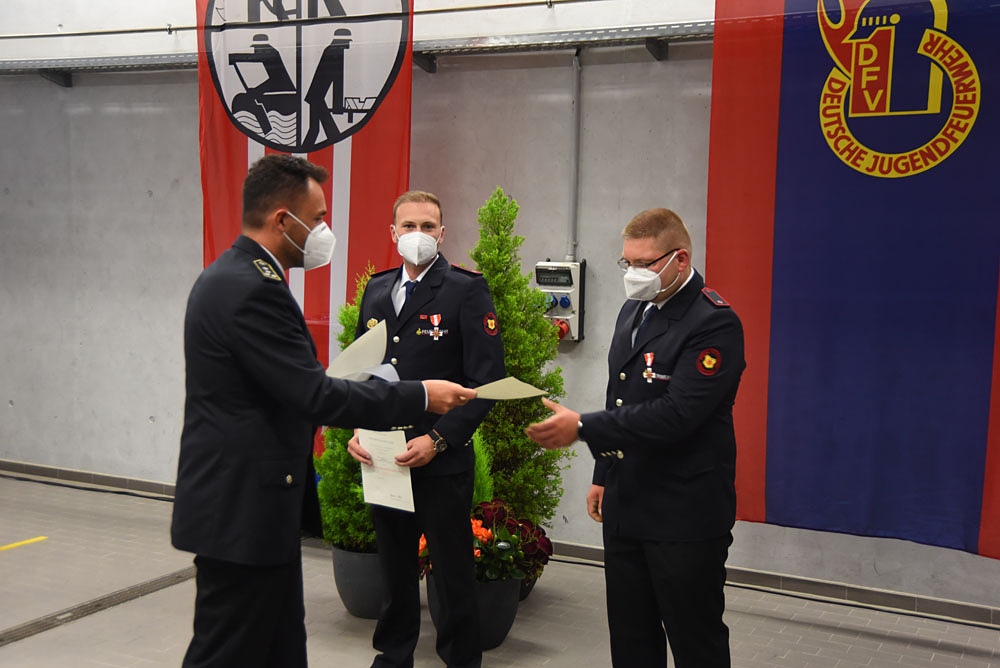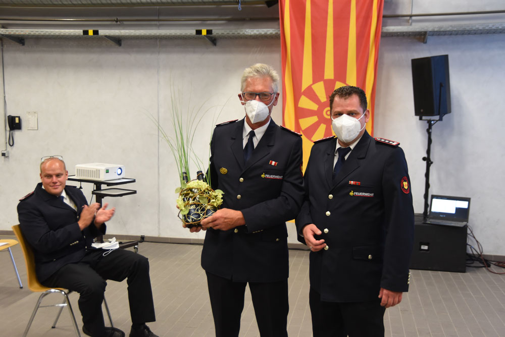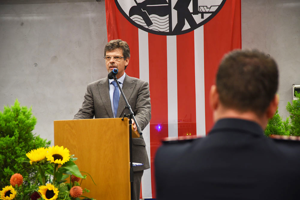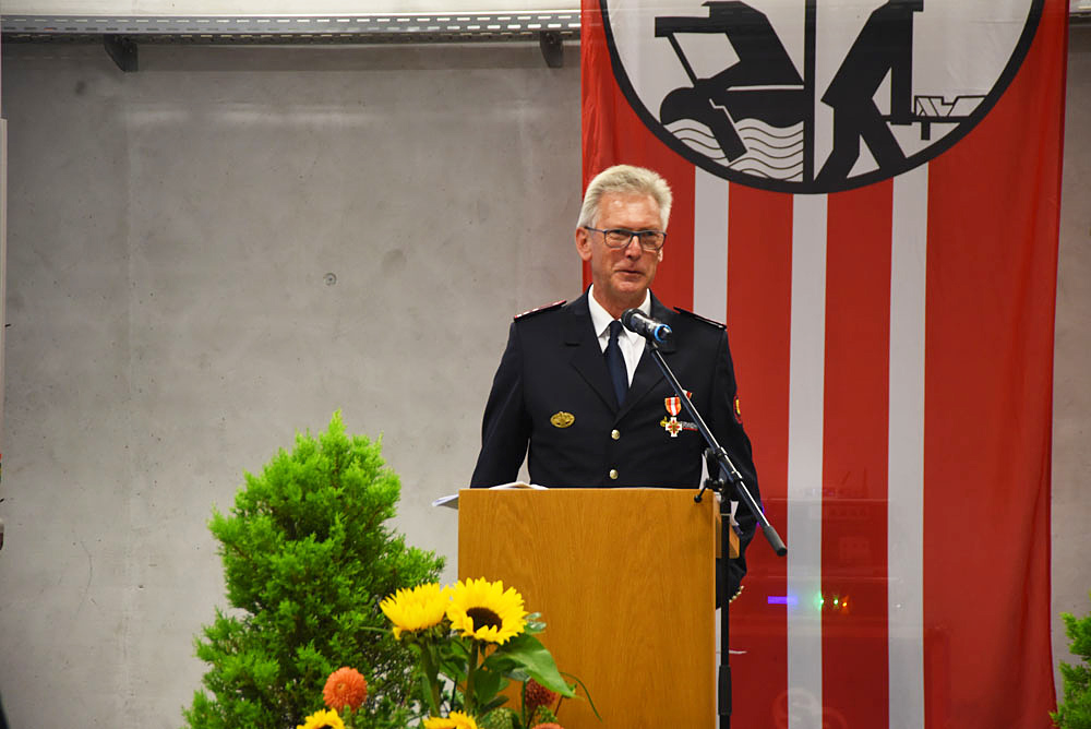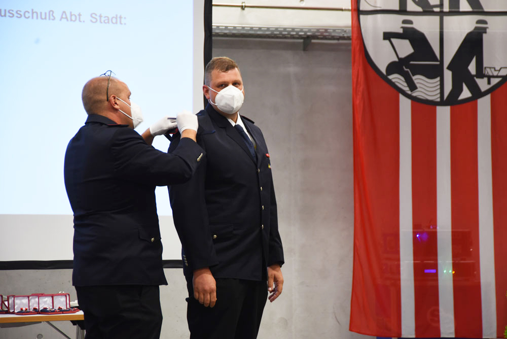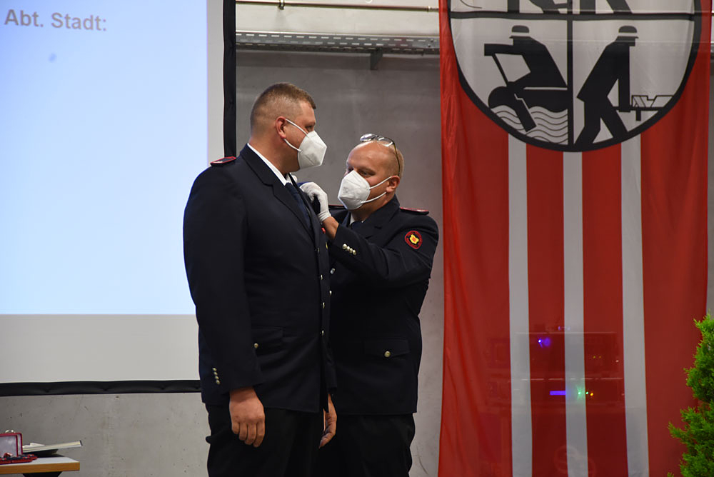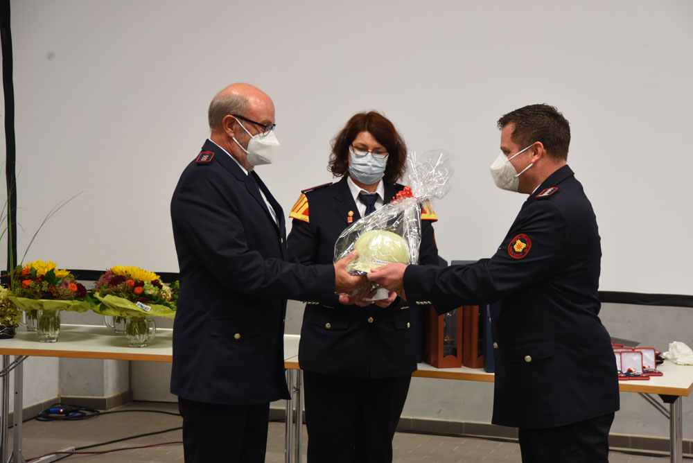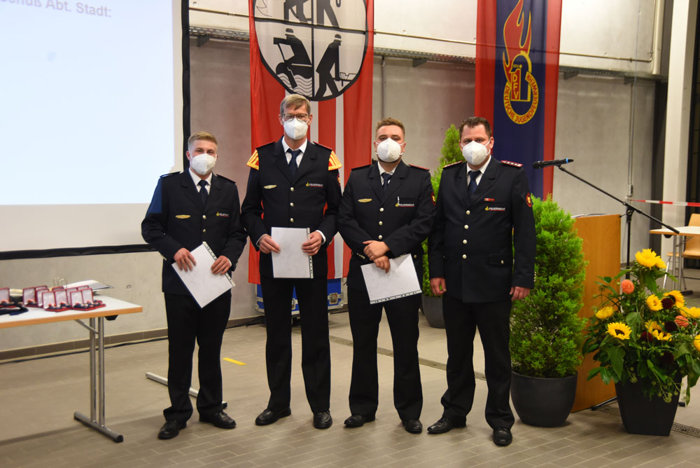 Nachdem die Versammlung wieder vollzählig im Feuerwehrhaus war, wurden die Beförderungen ausgesprochen. Nach den Ansprachen des Bürgermeisters und des stellvertretenden Kreisbrandmeisters wurden die Ehrungen des Landes Baden-Württemberg für langjährigen Feuerwehrdienst verliehen.