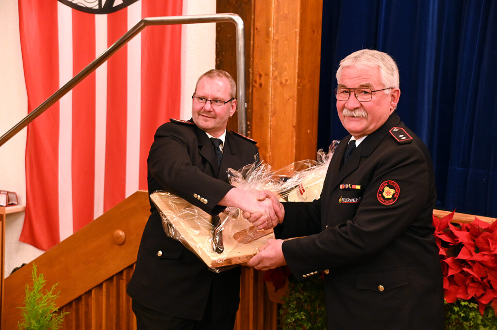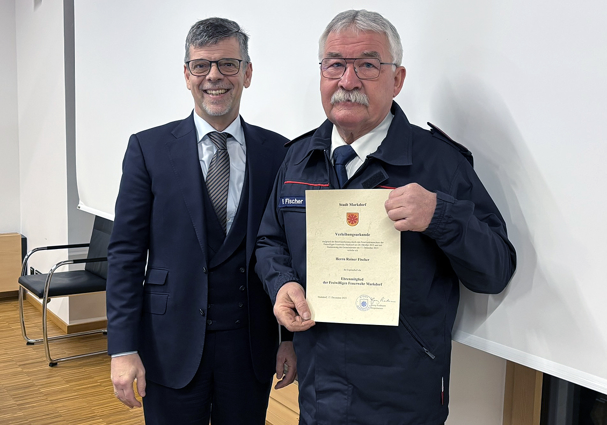 Unser ehemaliger zweiter stellvertretender Gesamtkommandant Rainer Fischer war am 17. Dezember 2025, nach Empfehlung des Feuerwehrausschusses, vom Gemeinderat zum Ehrenmitglied der Feuerwehr Markdorf ernannt worden. Jetzt erhielt Rainer noch ein Erinnerungsgeschenk und eine Laudatio zu seinem langjährigen produktiven Wirken in der Feuerwehr als kleiner Abschied für seinen Übertritt in die Altersabteilung.
