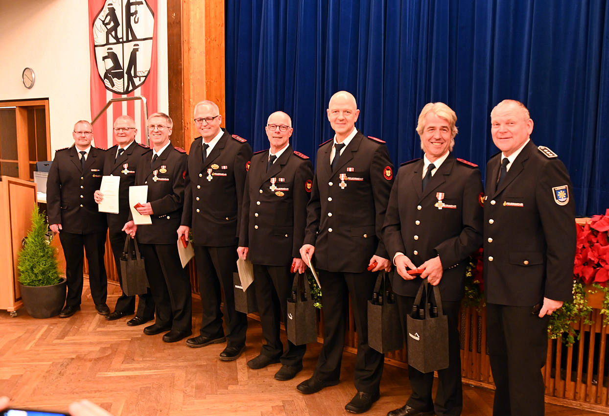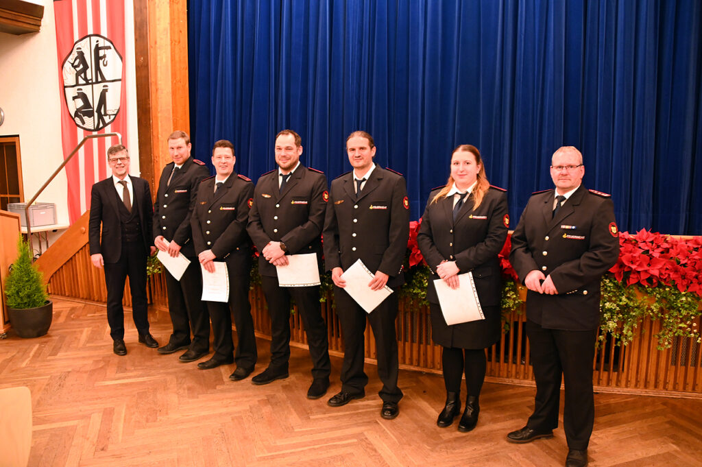 Von stellv. Kreisbrandmeister Dagobert Heß wurden mit der Landesehrung Ehrenkreuz des Landes Baden-Württemberg für 25 Jahre Feuerwehrdienst Michael Flad und Tobias Schmidschneider ausgezeichnet, und mit dem Ehrenkreuz des Landes Baden-Württemberg für 40 Jahre Feuerwehrdienst Bernd Brielmayer, Gerhard Krug, Hubert Rössler, Hermann Eichenhofer, Alexander Perle und Markus Bucher (von links).